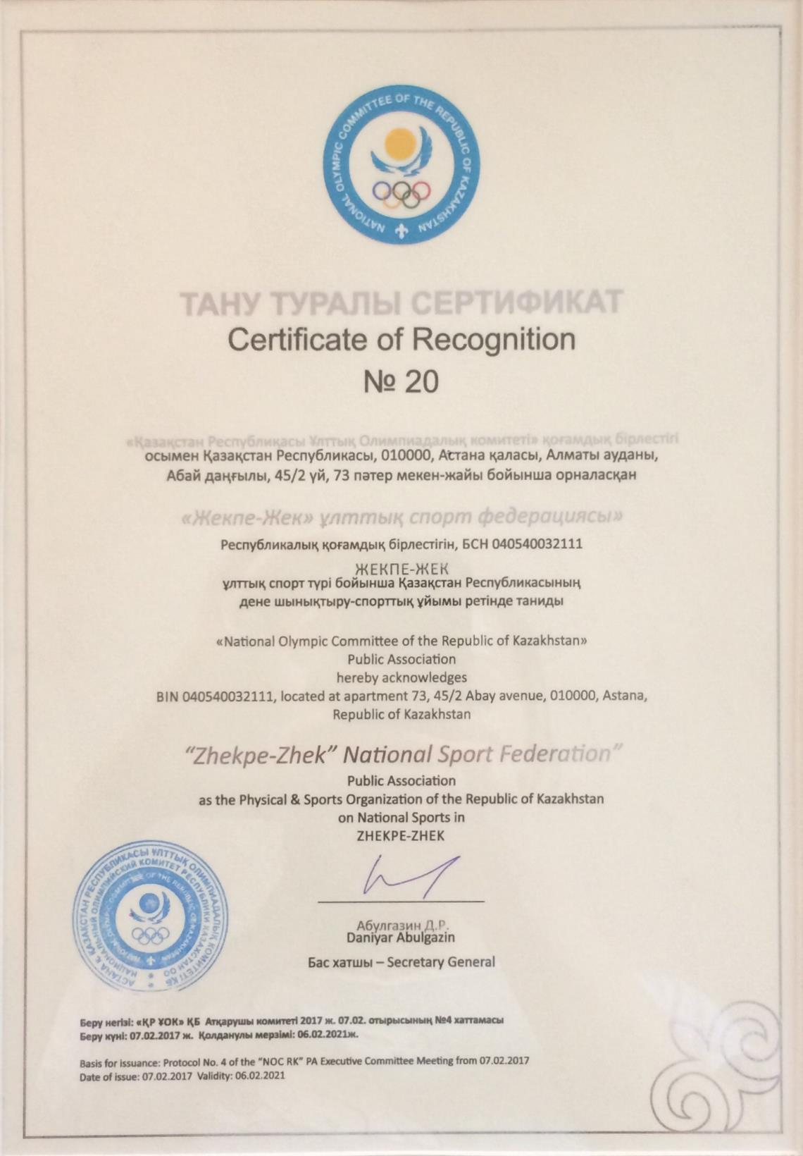 «Жекпе-Жек» ұлттық спорт федерациясы» республикалық қоғамдық бірлестігін Жекпе-Жек ұлттық спорт түрі бойынша Қазақстан Республикасының дене шынықтыру-спорттық ұйымы ретінде тану туралы сертификат